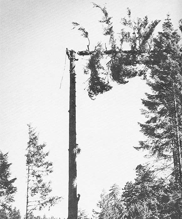 Photo Credit: A logger topping a coastal redwood in Mendicino County, California, to create a spar tree used in a cable yarding operation. http://www.mendorailhistory.org/1_logging/spar_trees.htm