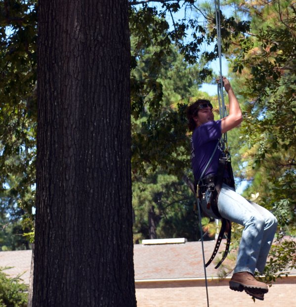 Photo Credit: SFA forestry student Paul Patterson demonstrates tree-climbing techniques used by arborists. Thanks to Sarah Fuller for providing the photo.